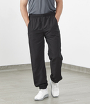 100% polyester microfibre with peached finish. Mesh lining with polyester satin lower leg lining. Showerproof and windproof. Elasticated waistband with inner drawcord. Two side pockets, right with zip. Rear pocket with tear release closure. Elasticated leg ends with ankle zips.