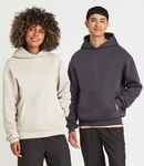 70% ringspun cotton/20% polyester/10% recycled polyester.* Cotton faced fabric. Brushed back fleece. Drop shoulder style. Oversized fit. Three panel double fabric hood. Front pouch pocket with inner media pocket. Ribbed cuffs and hem. Twin needle stitching. Tear out label.